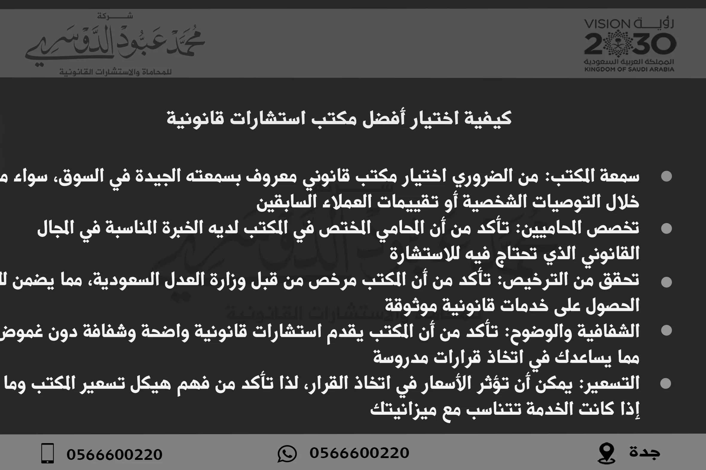 في الختام قد يظن البعض أن طلب الاستشارة من أفضل مكتب استشارات قانونية هو أمر ثانوي ومكلف، ولكن الحقيقة أن الحصول على استشارة دقيقة لا تقدم لك فقط الرأي القانوني السليم، بل قد تجنبك أيضاً خسائر مادية ومعنوية. لذلك وقبل التصرف بنفسك اطلب رقم مستشار قانوني اون لاين في جدة السعودية من أحد مكاتب شركة محمد عبود الدوسري للمحاماة والاستشارات القانونية على call:00966566600220.